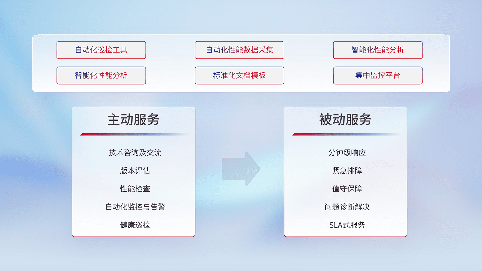 智能化工具和标准化文档,,保障服务质量,,提供主动服务(包含技术咨询、、、版本评估、、、性能检查、、、、自动化监控与告警、、、、健康巡检)和被动服务包含(分钟级响应、、、紧急排障、、、值守保障、、、、问题诊断解决、、SLA服务)。。