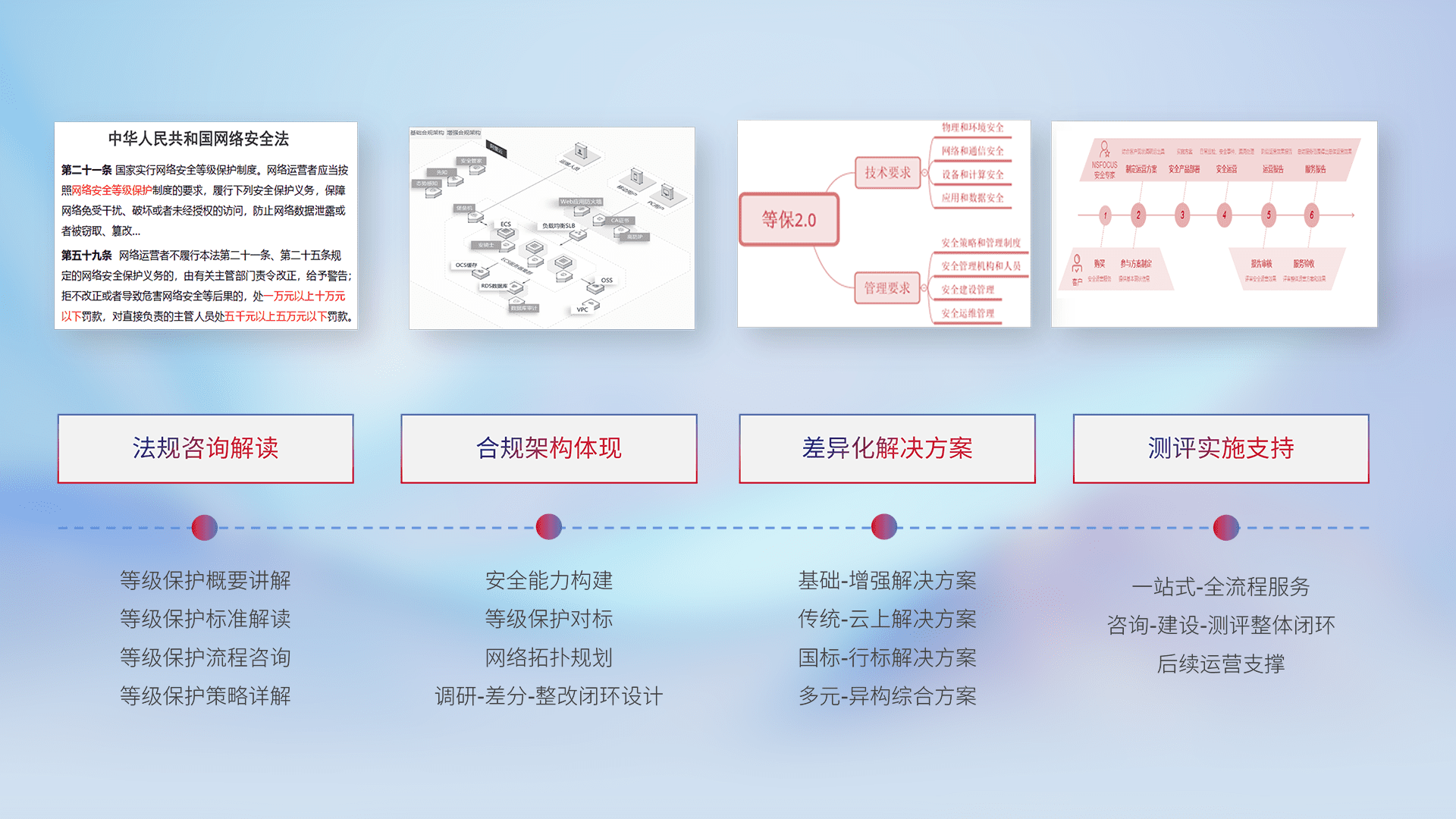 通过专业的法律咨询解读、、、合规架构体现、、、、差异化解决方案、、、、测试实施支持等服务,,,为客户量身打造等保合规体系。。